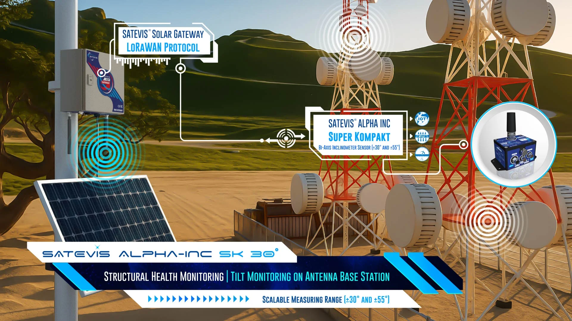 Satevis® Alpha Inc SK 30B (SK: Super Kompakt) is a high-precision wireless bi-axis inclinometer sensor (scalable range ±30° / ±55°) that integrates the open-standard LoRaWAN® protocol, making it ideal for Structural Health Monitoring (SHM), geotechnical applications, land surveying, and smart infrastructure projects. Designed for scalability and future-proofing, this evolutive device supports sensor fusion (Easy-Sense function), allowing seamless integration with external environmental sensors for expanded functionality. The Satevis® Alpha Inc SK 30B offers easy integration with third-party cloud platforms (TTN, Chirpstack, Datacake…) or CommonSense®, our proprietary cloud software, ensuring flexible deployment and real-time data insights. With its robust performance and adaptability, the Satevis® Alpha Inc SK 30B is the smart choice for precision monitoring in critical infrastructure applications. |